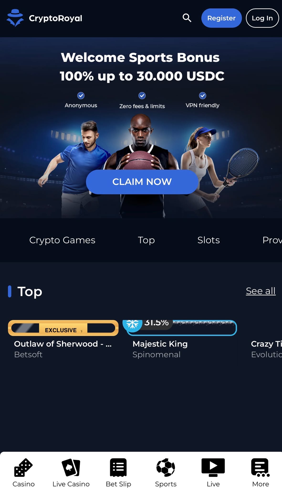 CryptoRoyal greets you with a clean, dark-toned interface that keeps primary actions (Sports, Casino, Live, Promotions, and the cashier) anchored in a fixed header. Reviewers characterize the desktop layout as “simple but effective,” noting that scrolling is minimal and core links (registration, live chat, T&Cs) are always in view.