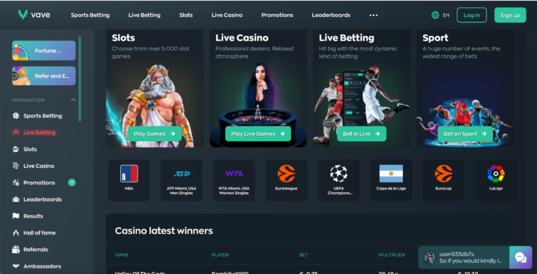 Vave features a dark background with neon teal accents, a fixed top bar listing “Sports Betting, Live Betting, Racing, Slots, Live Casino, Promotions,” and a left-side bar that expands on these options. The significant, edge-to-edge thumbnails scroll smoothly even on 4K monitors, and key actions stay pinned in the header, so you never have to hunt for them.