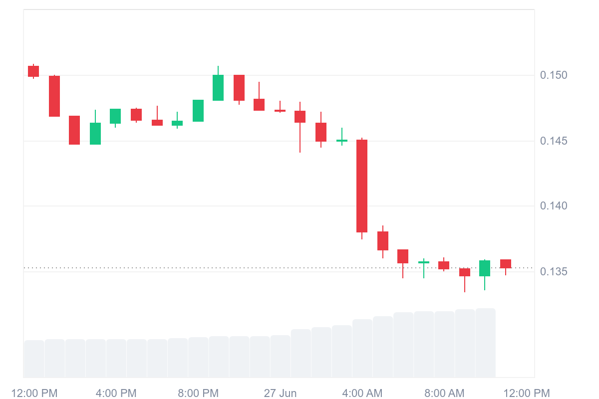 The token saw a sharp decline in the early hours, falling from around $0.145 to a low of approximately $0.131 before stabilizing at lower levels.