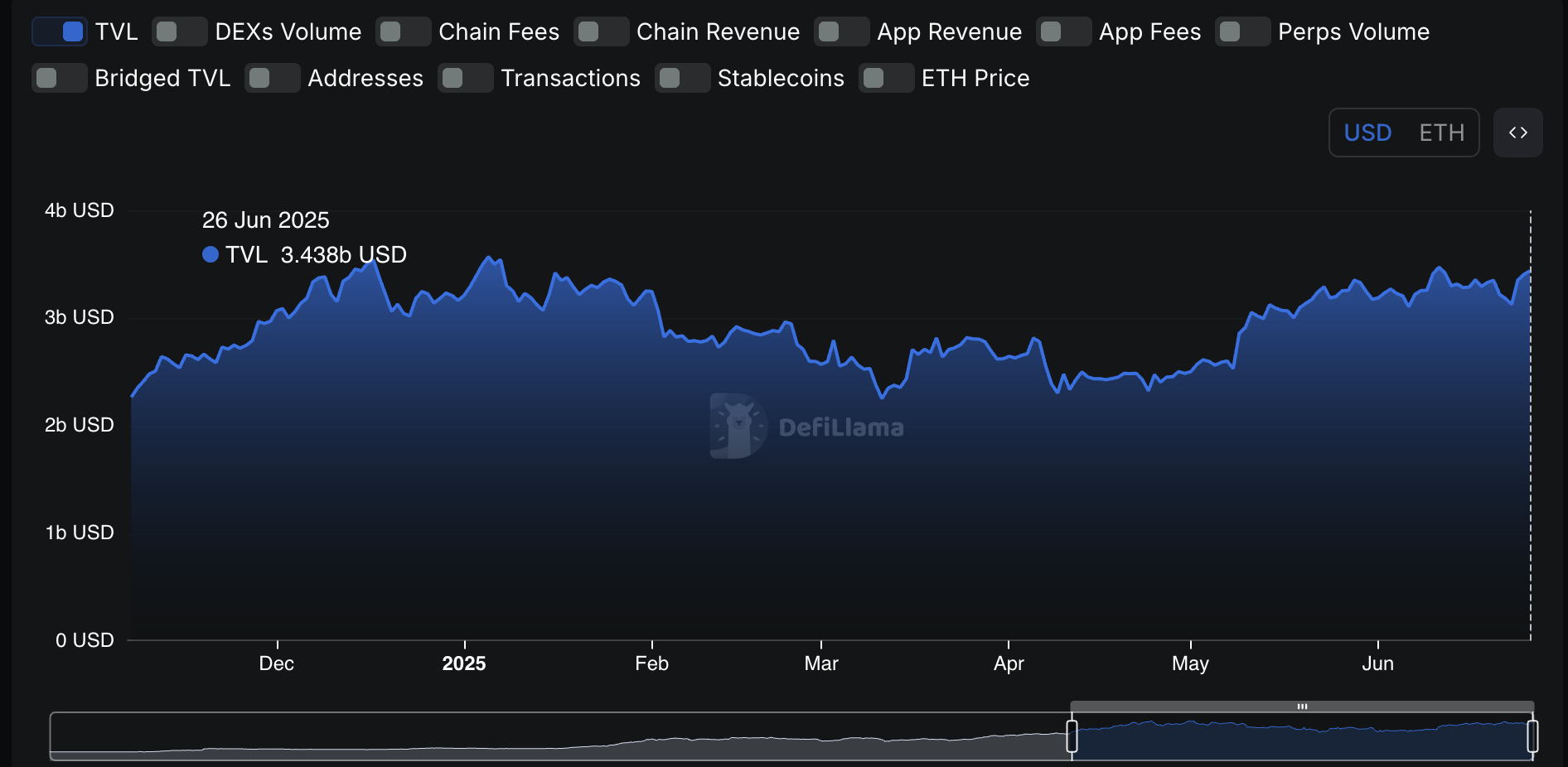 Base has seen steady traction throughout 2025. As of 26 June, data from DeFiLlama shows the total value locked (TVL) on the network has reached $3.438billion.