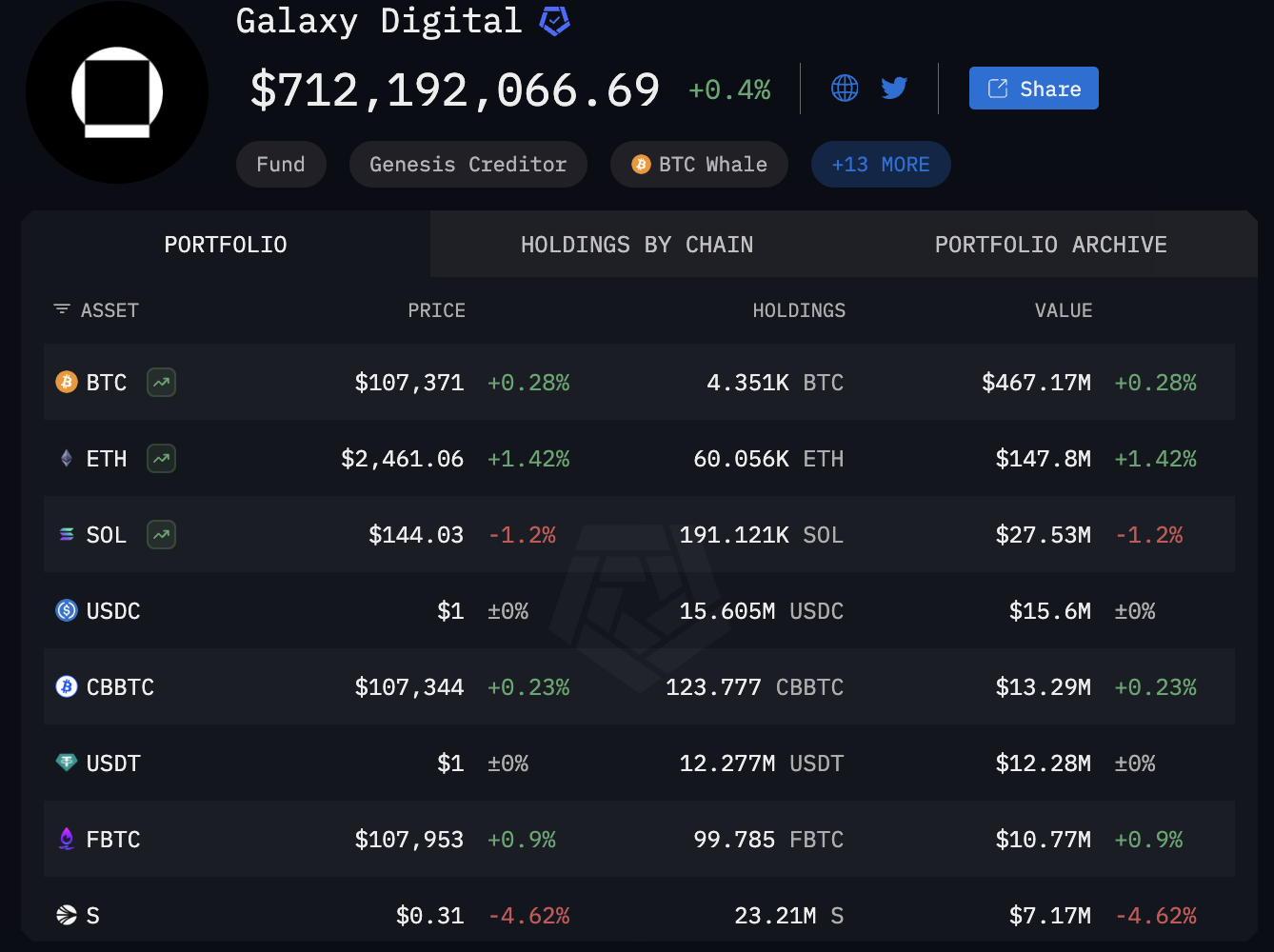 According to data from Arkham Intelligence, Galaxy holds more than $712m in digital assets. Its Bitcoin holdings alone are worth over $467m, putting it among the top five institutional holders.