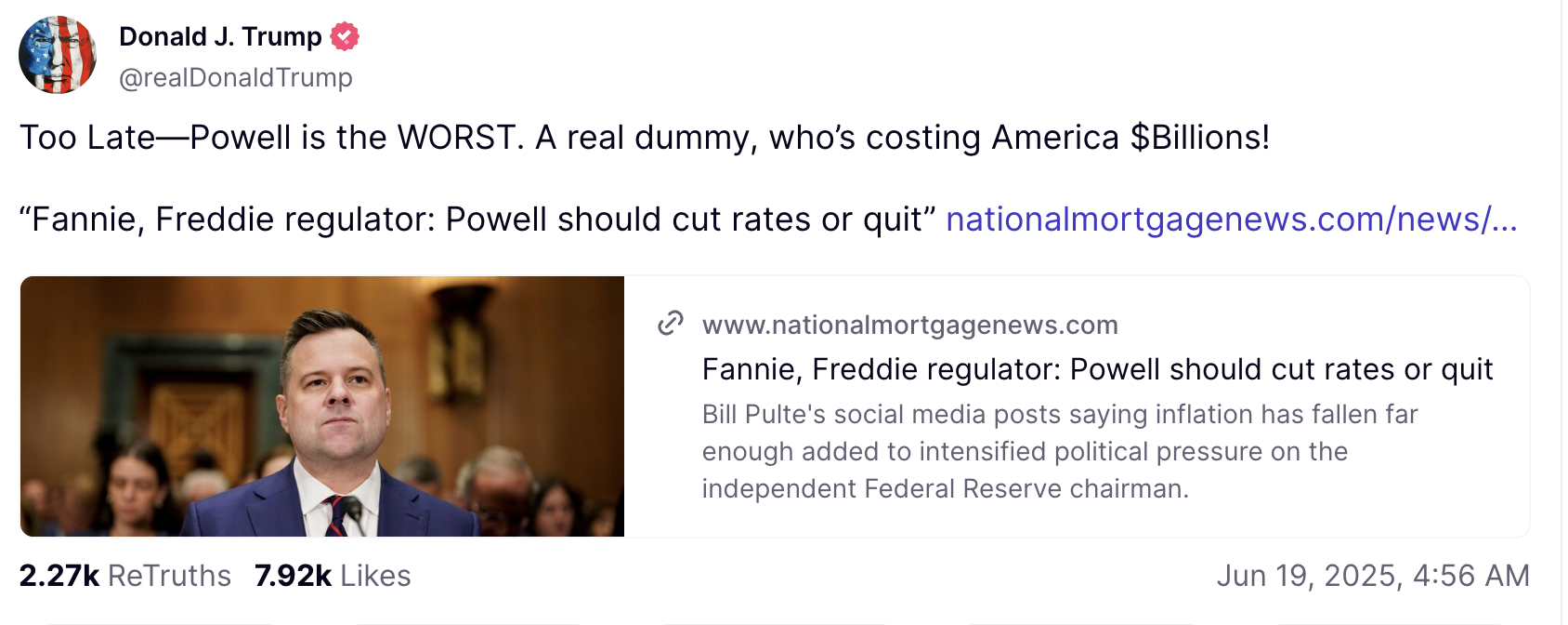 In another post on Truth Social, he also referred to the Fed Chair as a “real dummy”, insisting he’s costing Americans billions.