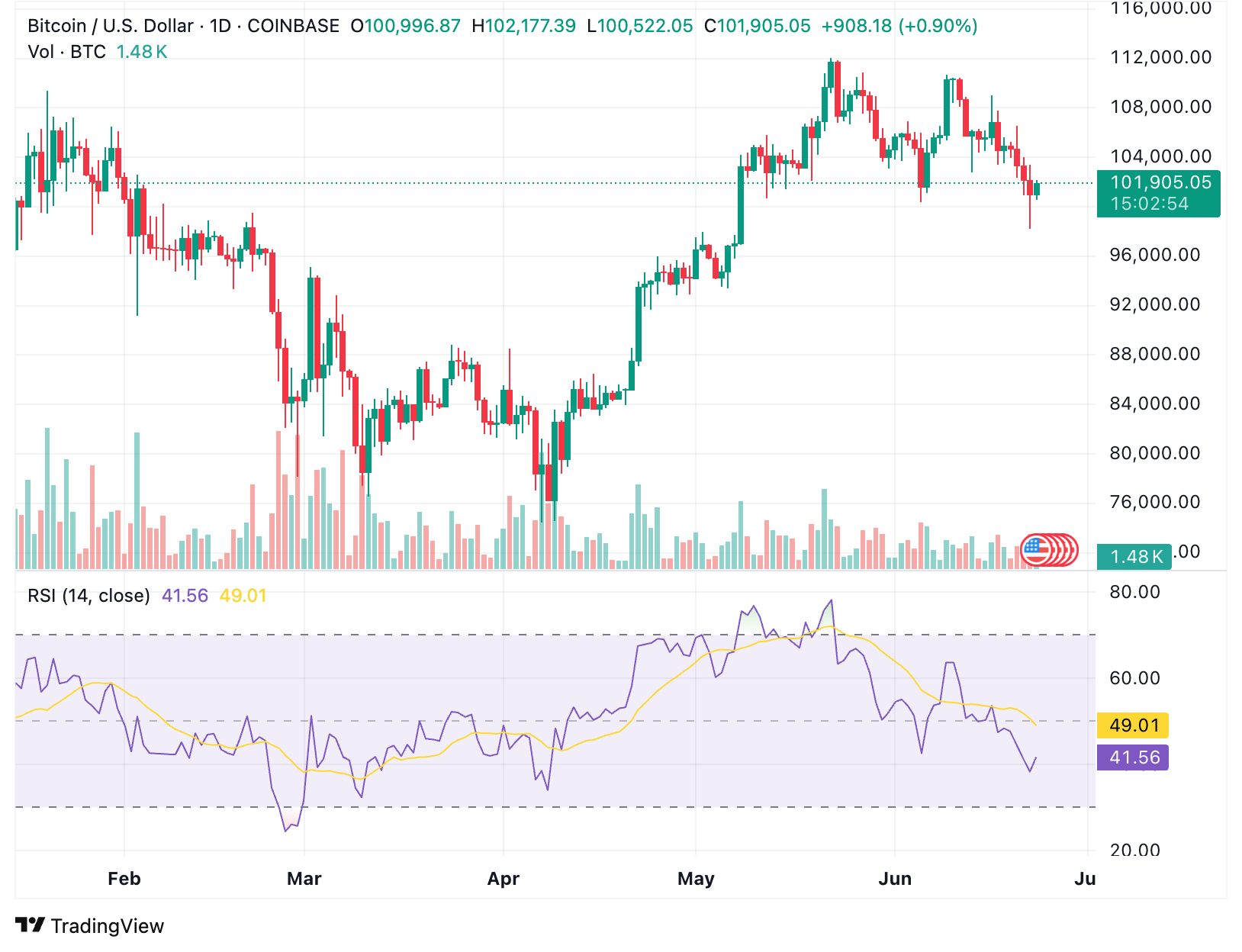 Bitcoin dropped to $100,522 over the weekend and touched a low of $98,225 on 22 June. It has since rebounded to around $101,455.