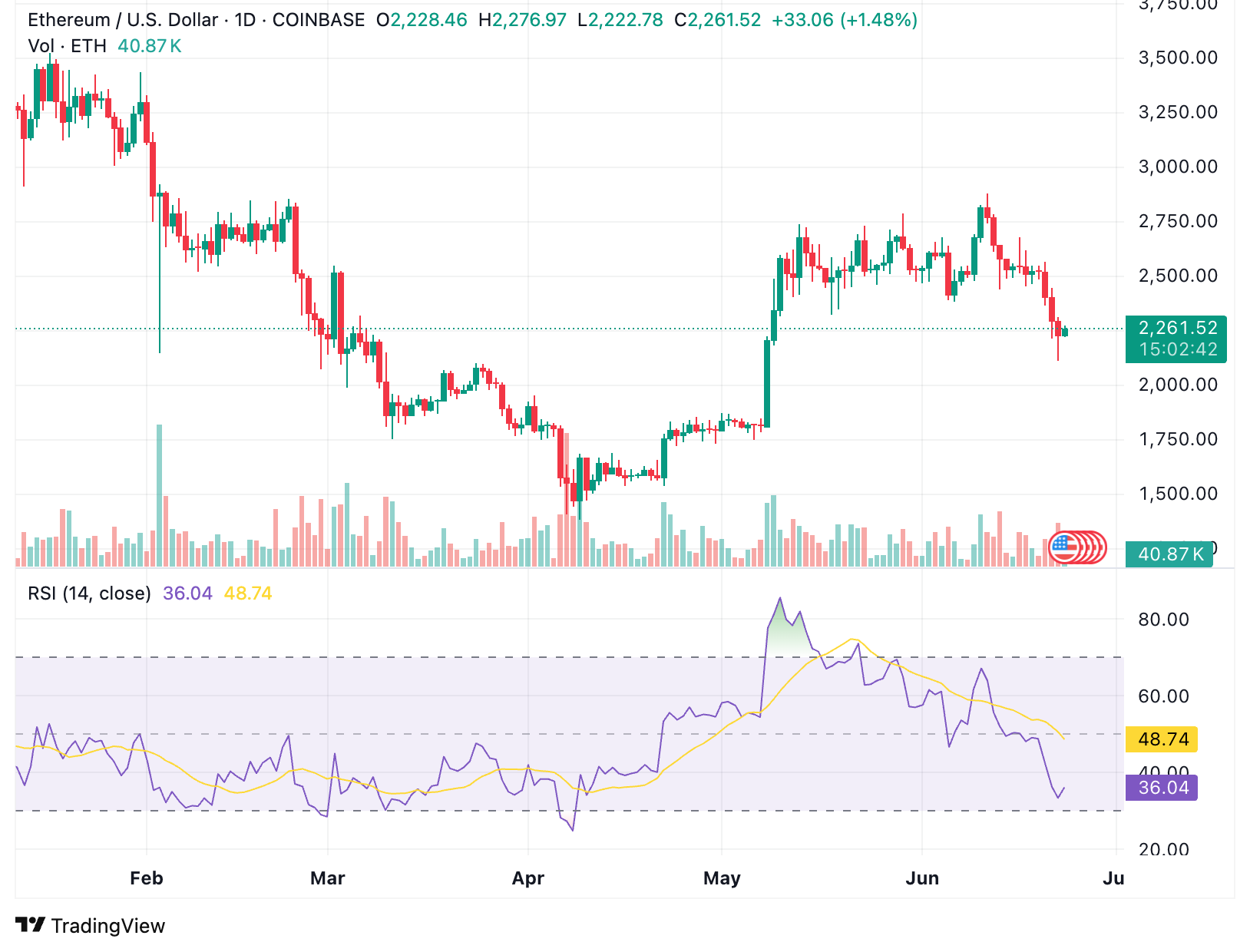Ethereum mirrored Bitcoin’s trajectory, dropping to $2,222 before recovering to $2,261. On 21 June, it hit a weekend low of $2,113 before rebounding.