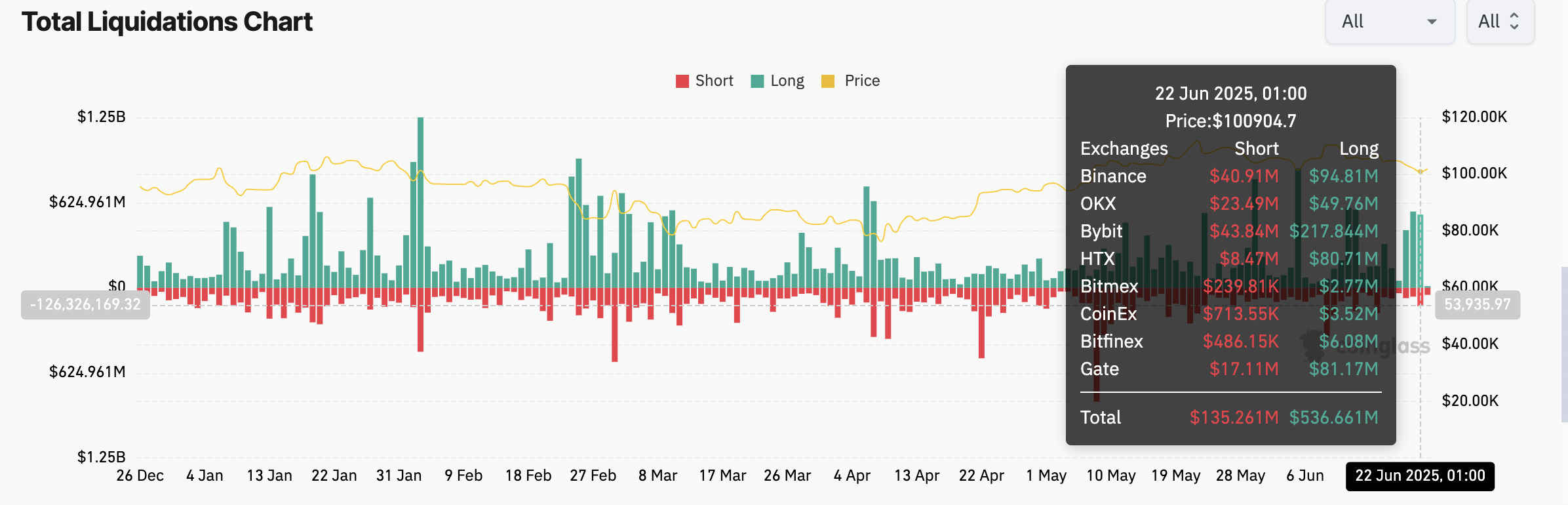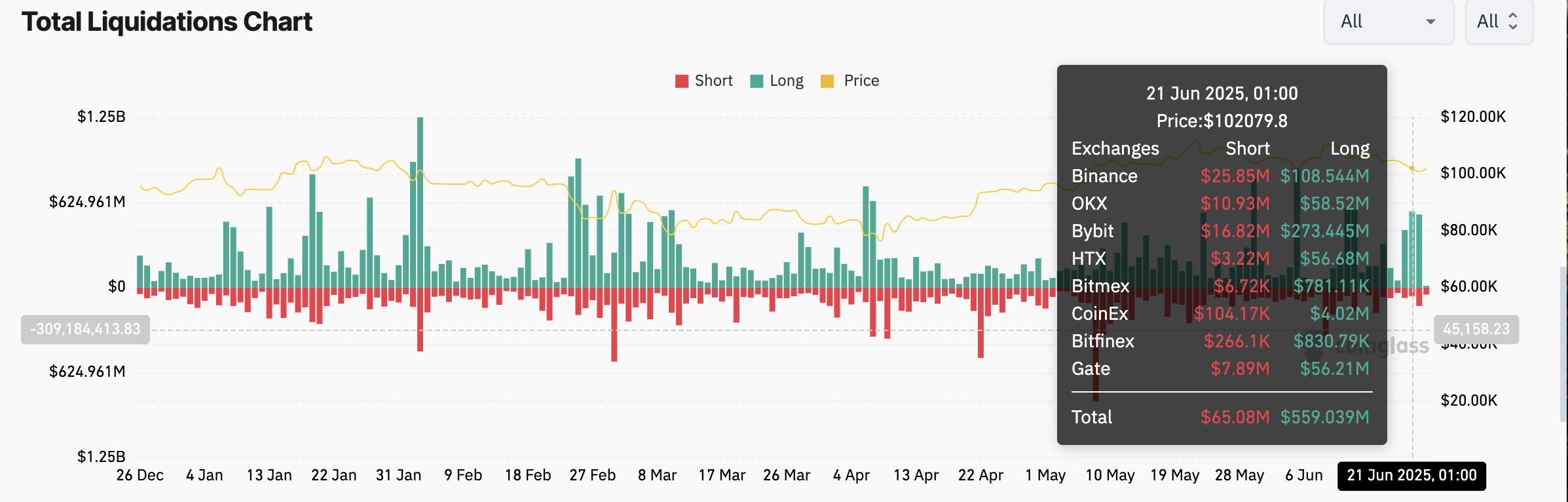 On 21 June, the day of the strikes, over $625million in crypto positions were wiped out, $559m of that from long liquidations.