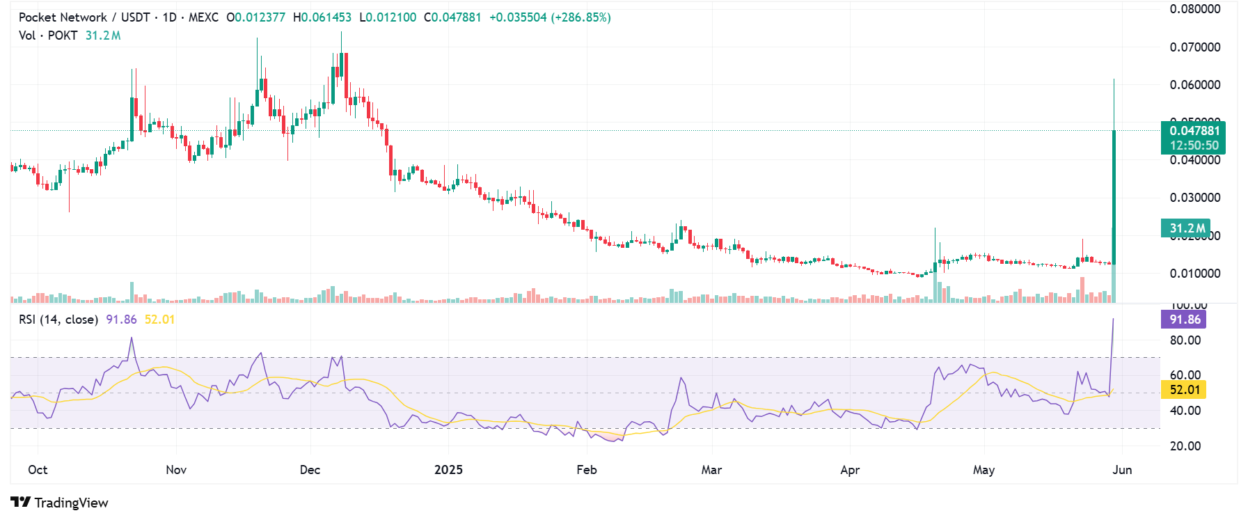 Based on the TradingView chart, POKT closed at $0.04788 on 30 May, recording an intraday gain of nearly 287%. Trading volume spiked to 31.2 million, confirming the surge in interest from new investors.