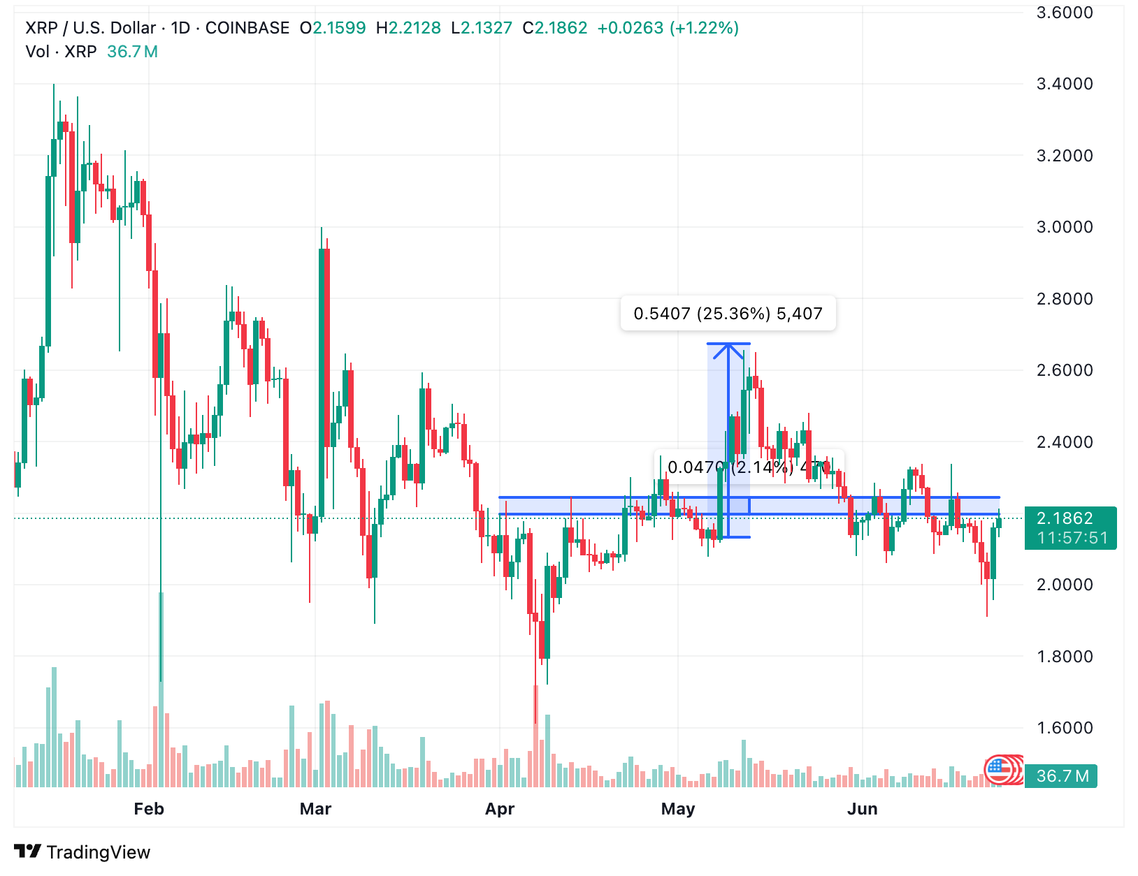 XRP began Q2 trading around $2.13, according to an analysis of a TradingView chart, and rallied to a quarterly high of approximately $2.73 in early May.