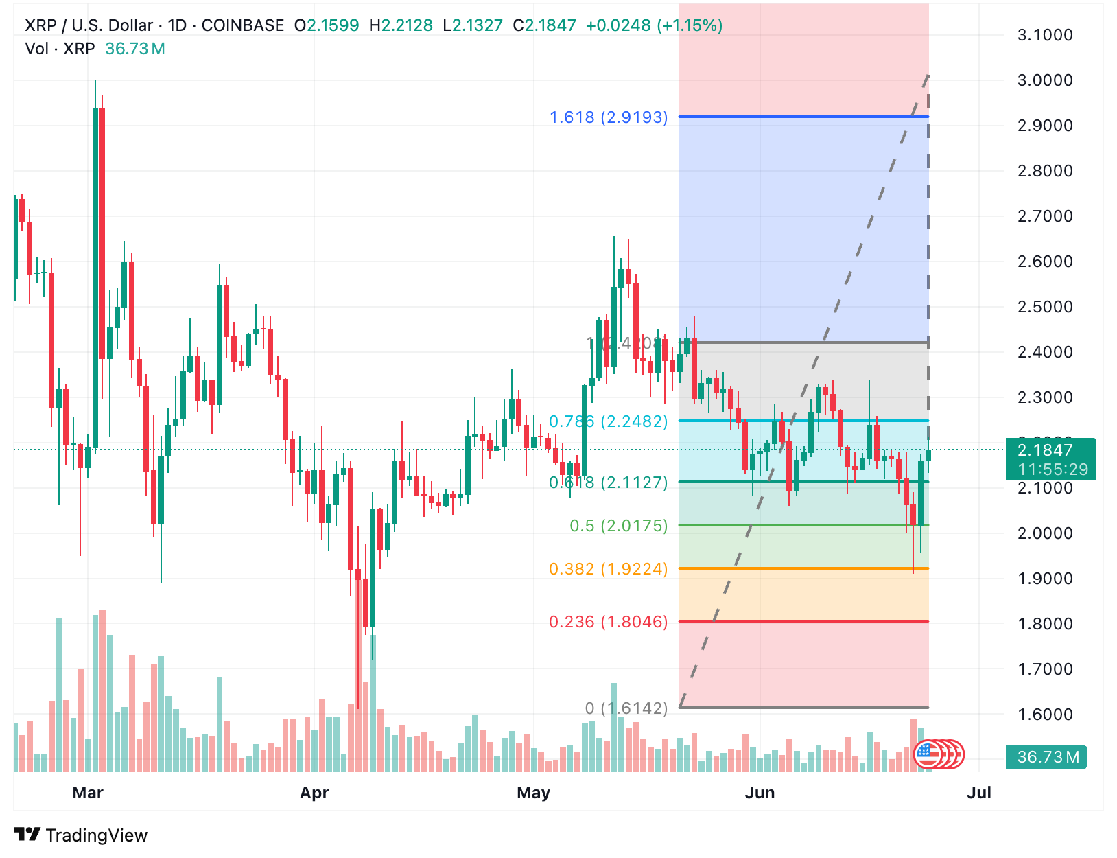 However, the token lost momentum by mid-June, briefly dropping to $1.97 before recovering. As of time of writing on 24 June, XRP is trading at $2.18, hovering near a key technical pivot.